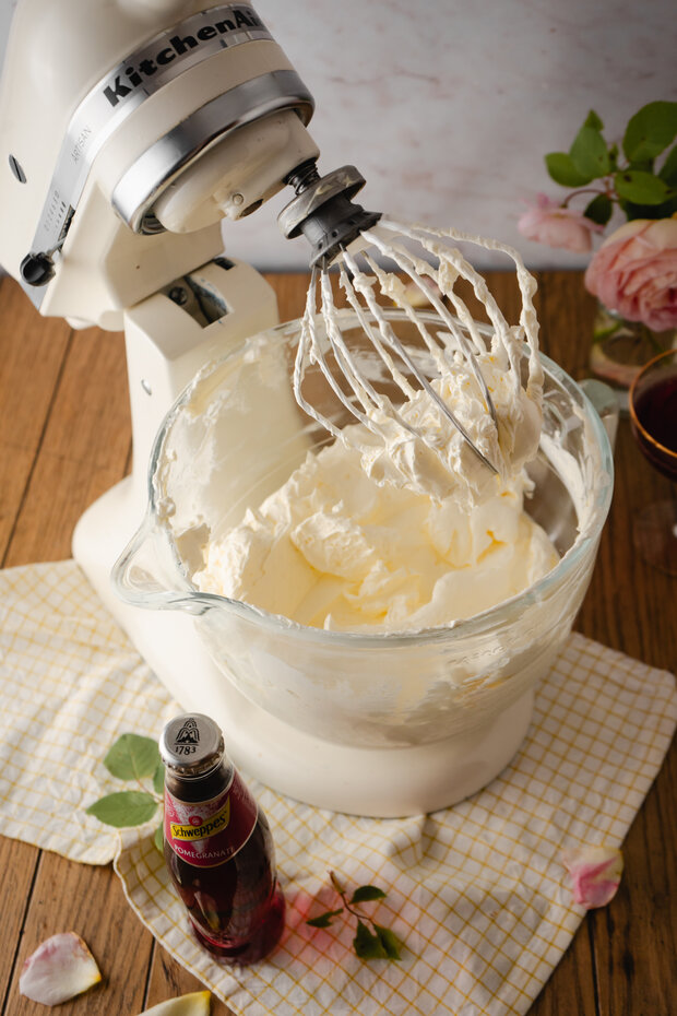 Sobald eine glatte Masse entstanden ist, die restliche Sahne dazugeben und alles aufschlagen, bis die Sahne steif geschlagen ist.