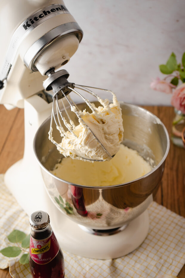 Die Butter stückchenweise bei mittlerer Geschwindigkeit einrühren.