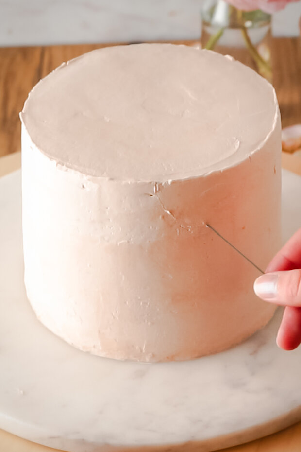 Zum Einstreichen zunächst nur eine dünne Schicht Buttercreme auftragen um die Krümel zu binden und die Torte zu stabilisieren. Die Torte 10 Minuten ins Gefrierfach geben, um die Buttercreme auszuhärten.
