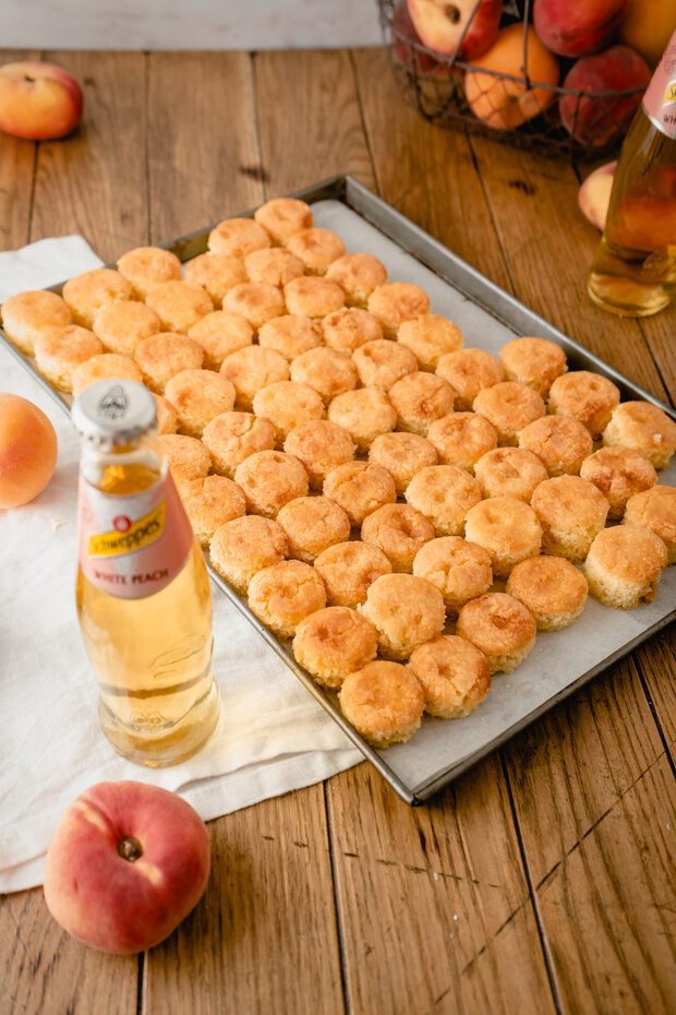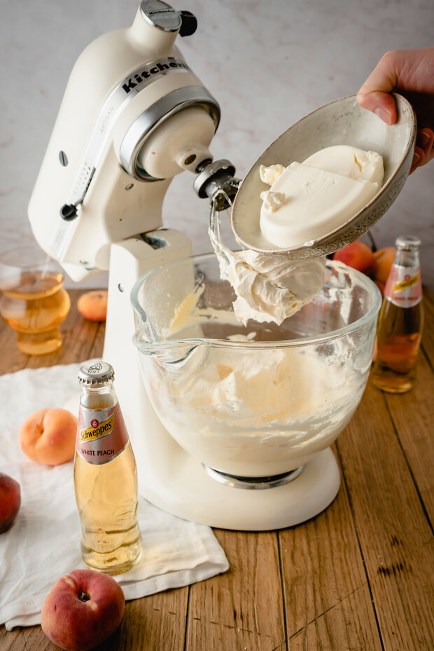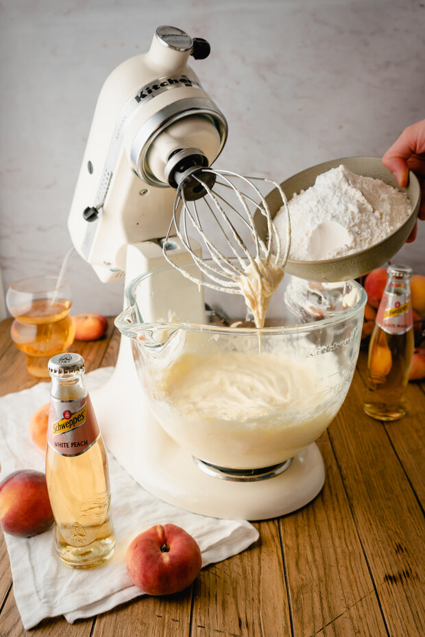 Nach dem Backen und Auskühlen den Teig mit Schweppes White Peach tränken.