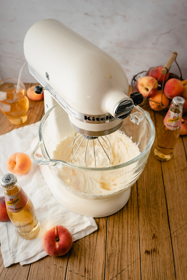 Pfirsiche zusammen mit Schweppes White Peach pürieren.