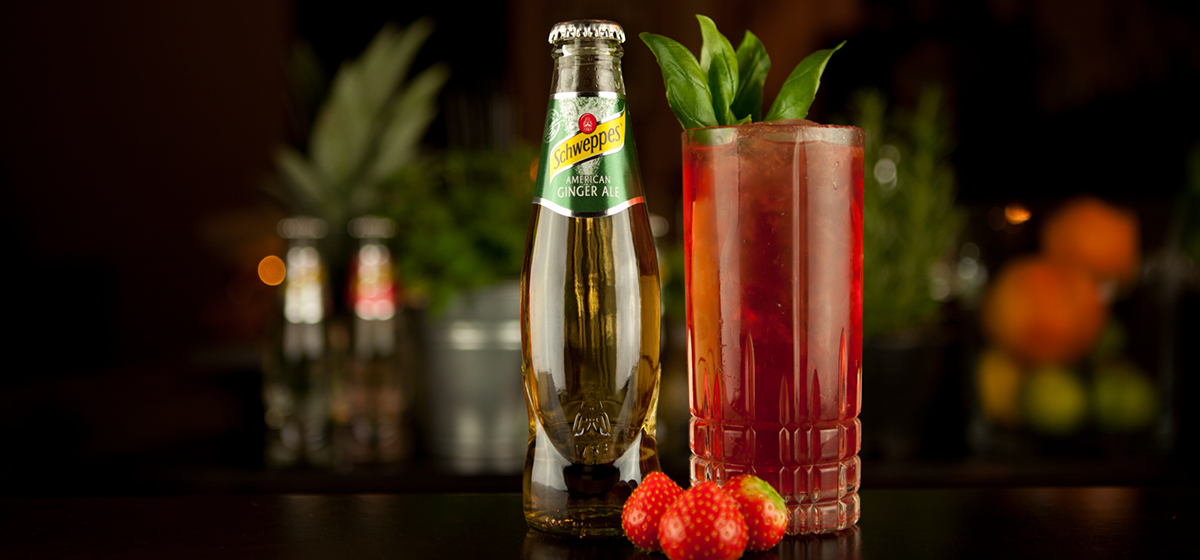 Zutaten: Schweppes American Ginger Ale. 4cl Wodka, 2cl Zitronensaft, 1cl Erdbeersirup