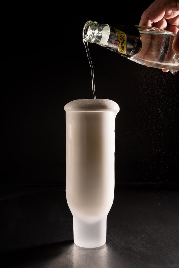 Mit Soda auffüllen, bis die Schaumkrone leicht über dem Rand ist,