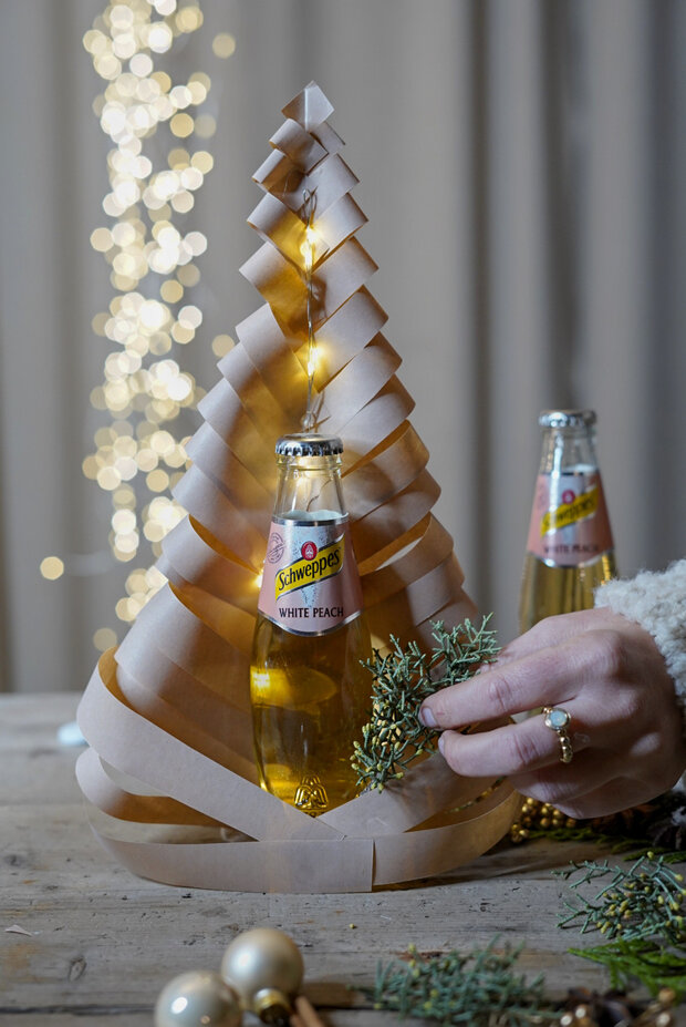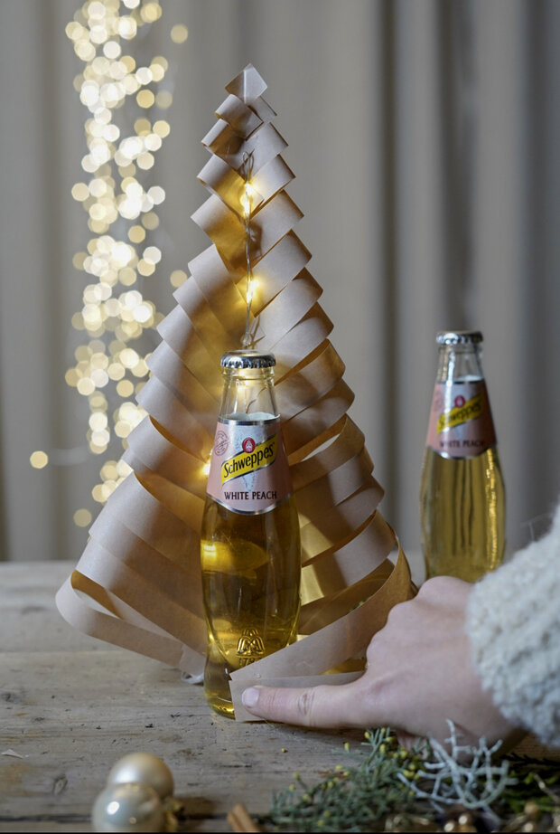 Weihnachten steht kurz bevor, und es ist Zeit, Geschenke einzupacken! Mit dieser einfachen und kreativen Idee kannst du ein ganz persönliches Geschenk kreieren. Verwende die Schweppes White Peach Flasche als Grundlage für einen einzigartigen Papierbaum, der mit Anis, Kugeln und grünen Zweigen geschmückt wird. Die Mini-LED-Beleuchtung sorgt für eine stimmungsvolle Atmosphäre. Viel Spaß beim Nachmachen!