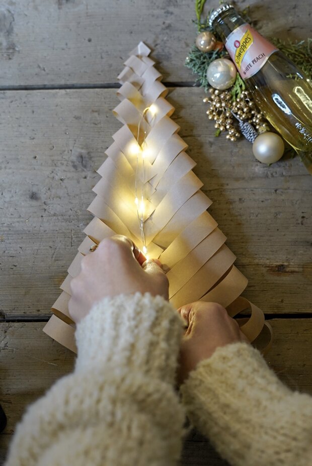 Die Mini LED Beleuchtung wird kunstvoll in die Mitte des entstandenen Baums platziert, um eine festliche Atmosphäre zu kreieren.