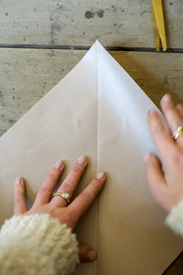 Zu Beginn wird das Papier geschickt über die Ecke gefaltet, um die Grundlage für einen eleganten Papierbaum zu schaffen.
