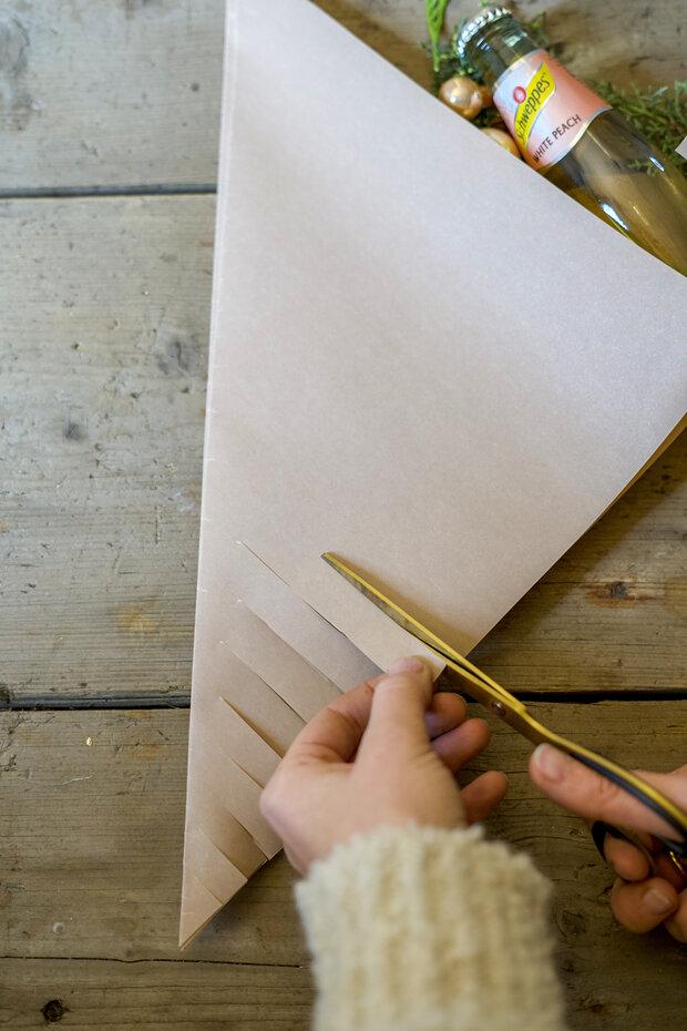 Mit einer ruhigen Hand schneidet man schräg bis fast zur Mitte des Papiers, wodurch schmale Streifen mit einem Abstand von 1 cm entstehen.