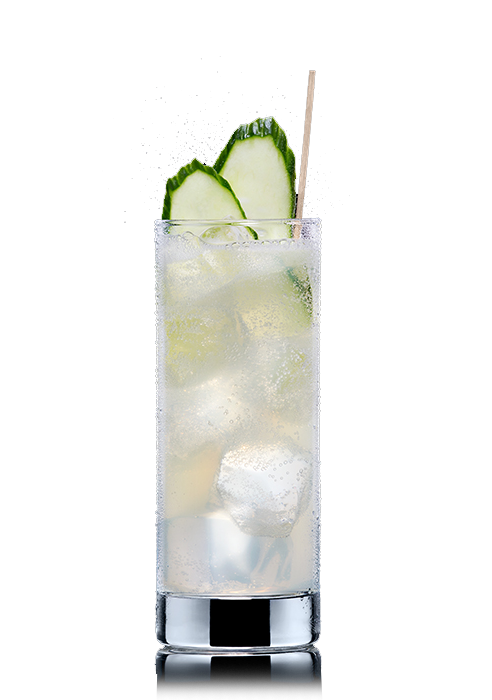 Alle Zutaten in ein mit Eiswürfeln gefülltes Longdrinkglas geben und mit Schweppes Dry Tonic Water auffüllen und eine Gurkenschale hinzugeben und leicht umrühren.