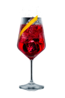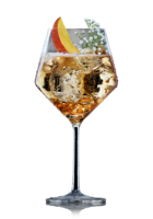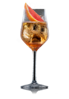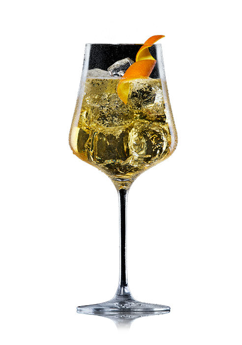 Alle Zutaten in ein mit Eis gefülltes Weinglas geben und mit einer Orangenzeste garnieren.