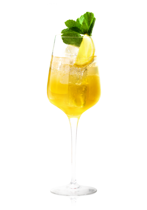 Alle Zutaten in einem Weinglas aus Eis geben und leicht unterrühren. Mit Minze und einem Stück Zitrone garnieren.