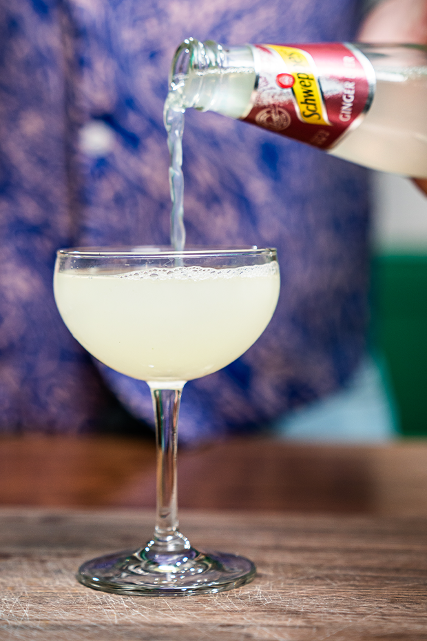 Alle Zutaten bis auf das Ginger Beer in einen Shaker geben und kräftig schütteln. Dann mit Schweppes Ginger Beer auffüllen und anschließend mit der Espuma toppen. Zu guter Letzt den Limettenstaub durch ein kleines Sieb auf den Drink streuen.