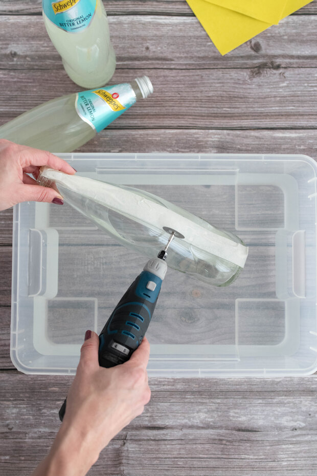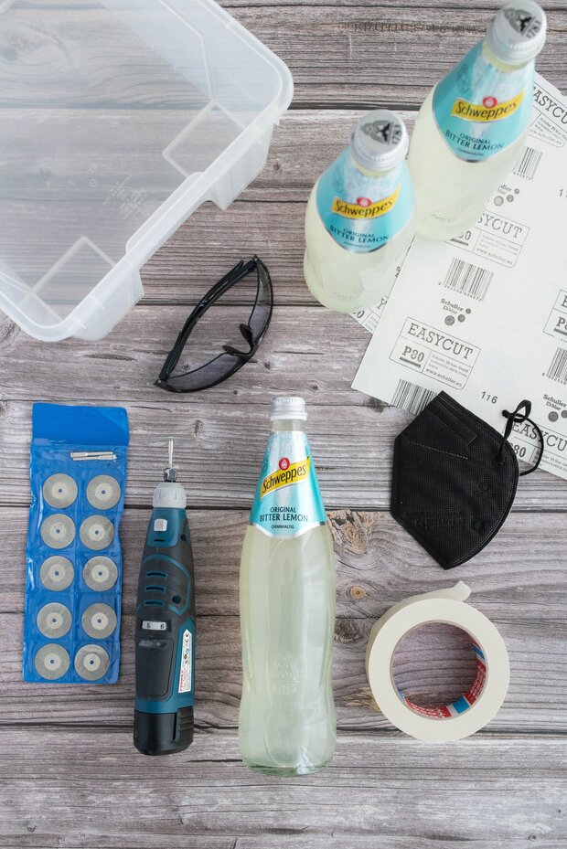 Die Diamant-Trennscheibe auf dem Dremel montieren und direkt an der Schnittlinie ansetzen. Vergiss außerdem nicht beim Schneiden der Flasche eine Schutzbrille und eine Feinstaubmaske zu tragen! Nun mit wenig Druck und geringer Drehzahl entlang der Schnittlinie und um die Flasche herum schneiden. Hier brauchst du ein wenig Geduld, da es doch einige Umrundungen benötigt, bis der Schnitt das Glas vollständig durchbrochen hat.