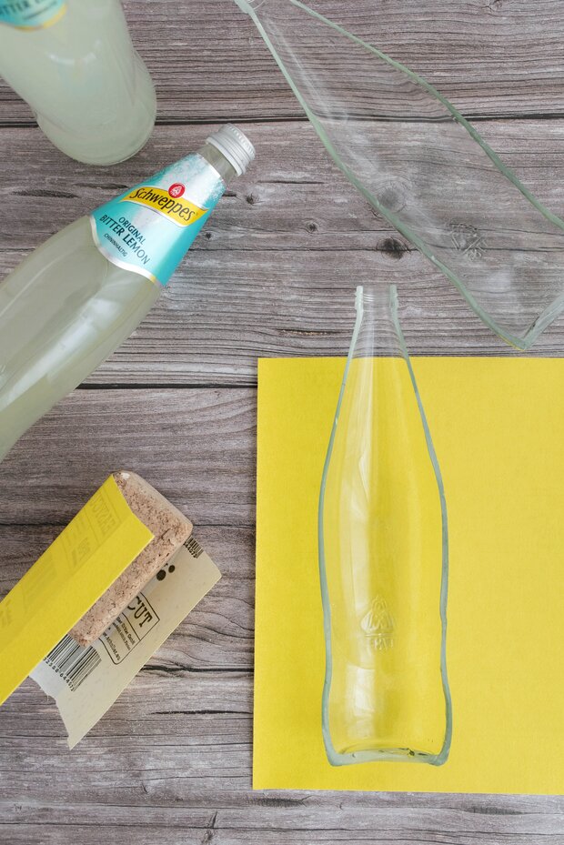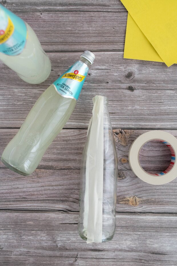 Markiere zunächst die Schnittlinie entlang der Flasche mit dem Kreppband. Am einfachsten orientierst du dich dabei an der seitlichen Naht, die jede Schweppes Glasflasche besitzt. Wenn du eine andere Form wünschst, kannst du die gewünschte Linie auch mit Permanent Marker aufzeichnen.