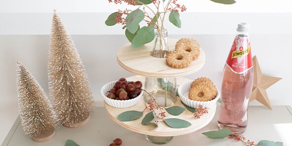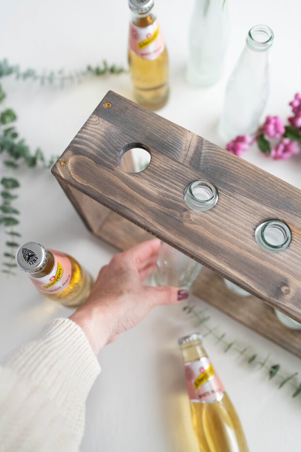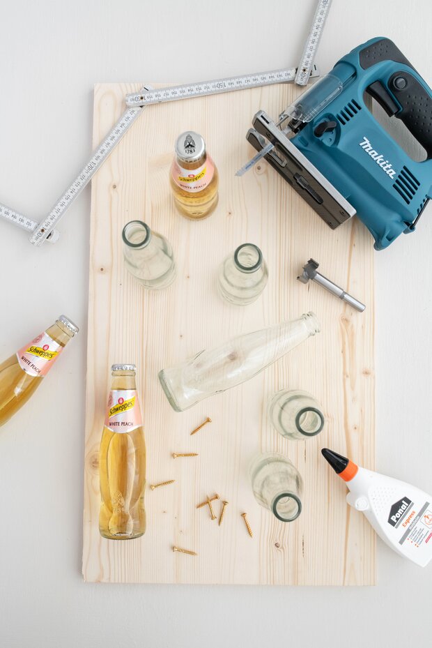 Wenn der Inhalt ausgetrunken ist, müssen leere Glasflaschen nicht immer gleich entsorgt werden. Aus ein paar Holzbrettern und den leeren Schweppes Flaschen lässt sich mit etwas handwerklichem Geschick ganz einfach eine dekorative Tischdeko-Idee gestalten, die sich je nach Jahreszeit immer wieder neu dekorieren lässt.