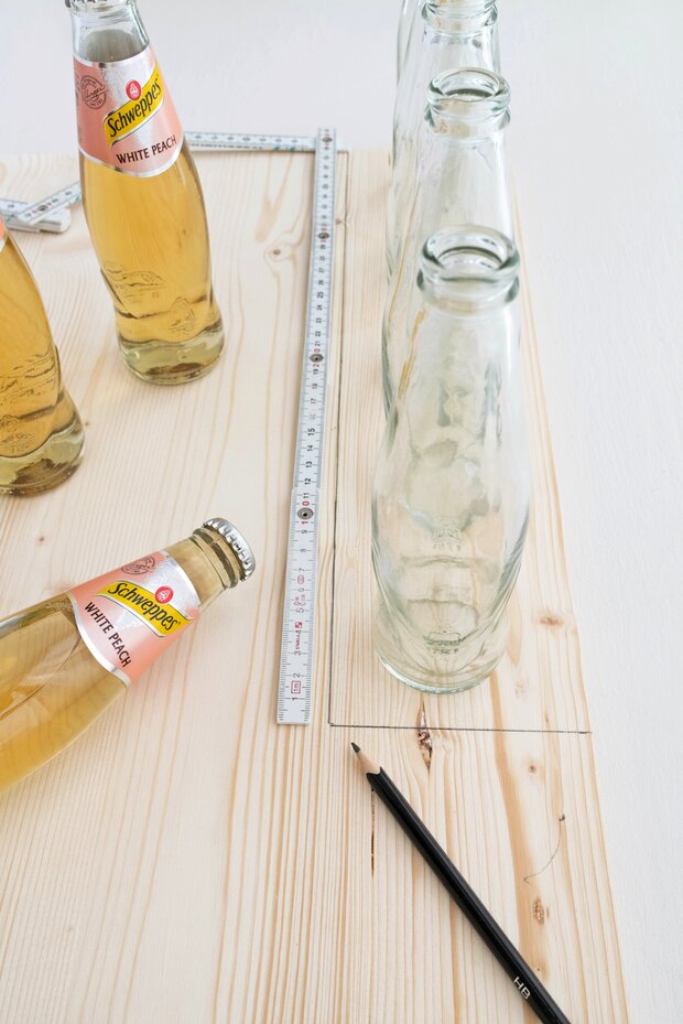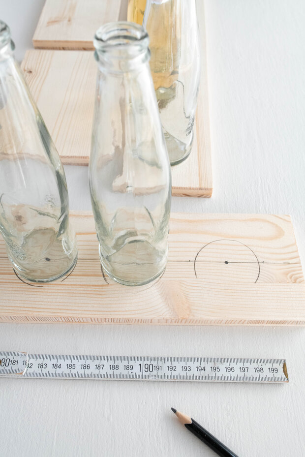 Wenn alle Bretter zugesägt und die Kanten mit Schleifpapier geglättet sind, nimmst du dir eines der langen Bretter für den oberen Teil deiner Vasenkonstruktion und zeichnest die Öffnungen für die kleinen Glasflaschen ein. Setze dafür alle 5 Flaschen mit einem Abstand von ca. 2cm mittig auf das Holz und markieren die Stellen, in denen du später mit der Lochsäge ansetzen möchtest.