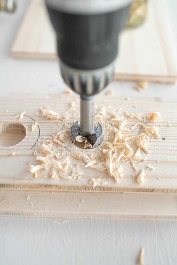 Wähle einen dazu passenden Lochsäge-Aufsatz aus und setze den Akku-Bohrschrauber in der Mitte der eingezeichneten Flaschenmarkierungen an. Mit leichtem Druck die fünf Löcher in das Holz bohren und die Ränder mit Schleifpapier glätten.